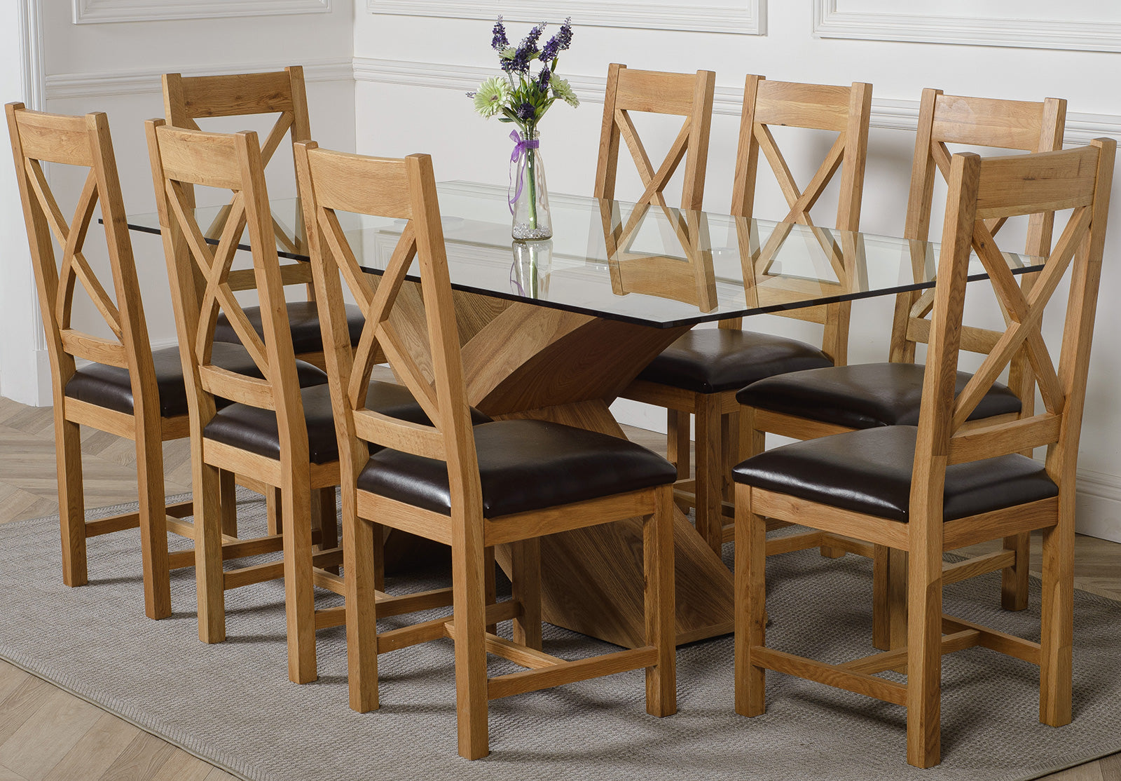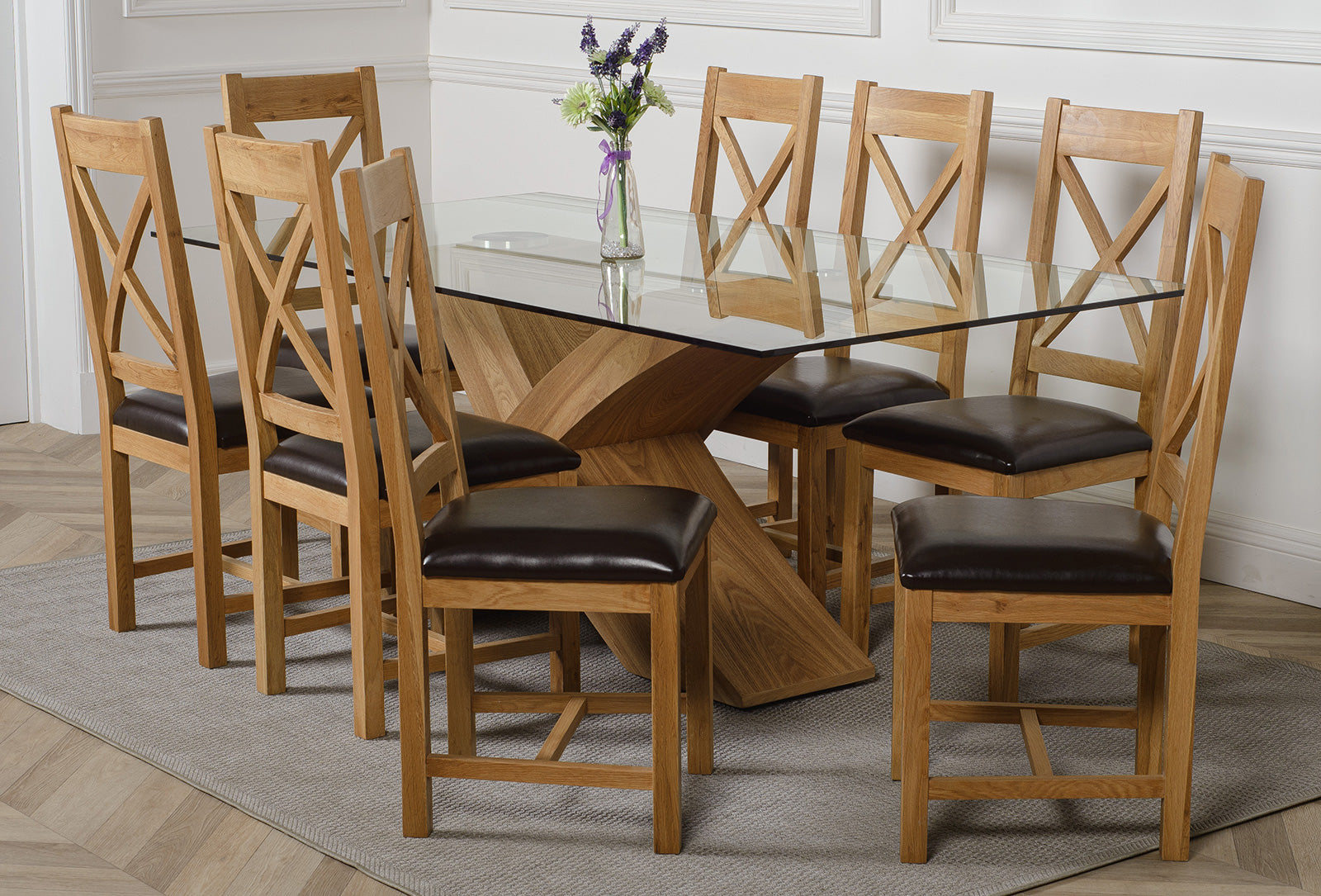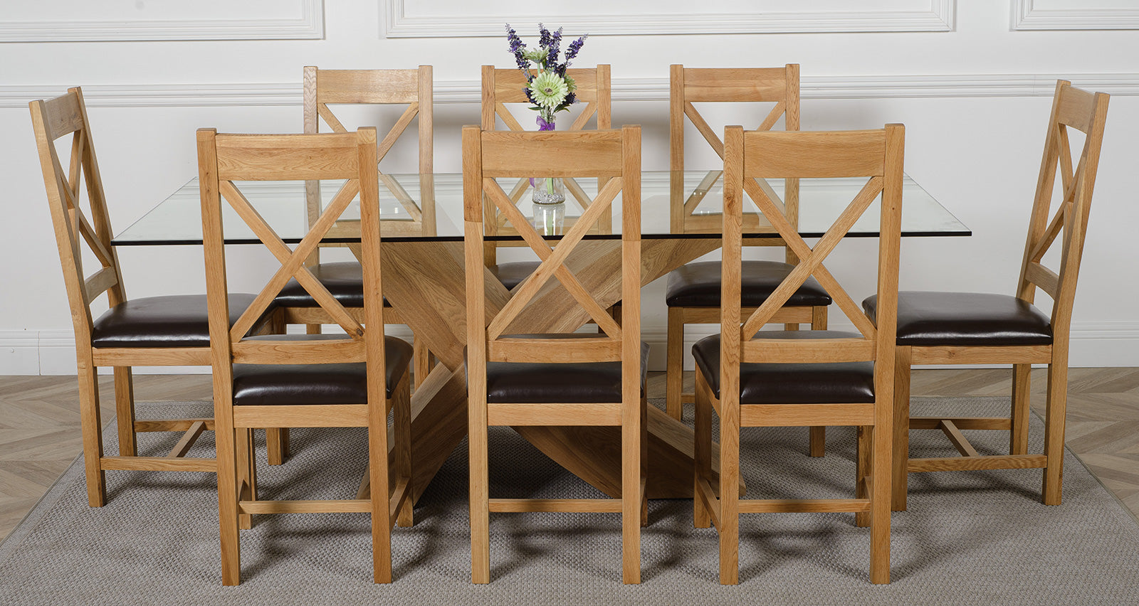 The Valencia large dining table and 8 chairs dining set is a stylish combination of glass and wood, crafted from 12mm thick tempered glass with a striking X shaped base made with real wood veneer finished in a natural oak colour. Combined with the comfortable Berkeley oak chairs this versatile dining table set will be the focal point of any kitchen or dining room setting.